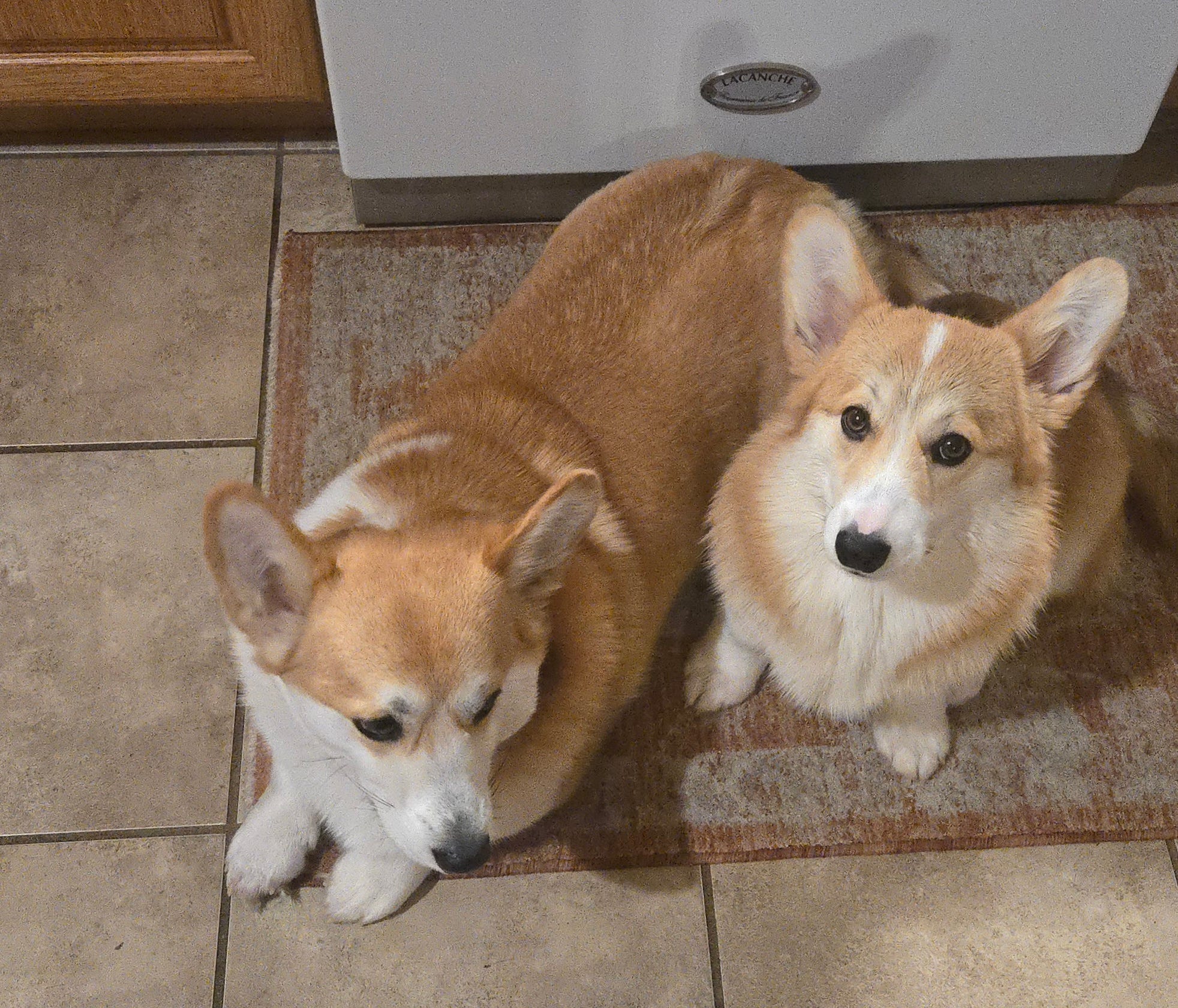 Love the Corgis ! They look very calm at present . They are gorgeous and look very happy and healthy!